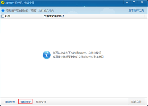 1、可完全粉碎恶意文件!被粉碎的文件不可恢复,需要慎重操作。您可以点击左下方的添加文件、文件夹按钮或直接拖拽想要删除的文件或文件夹到本窗口。