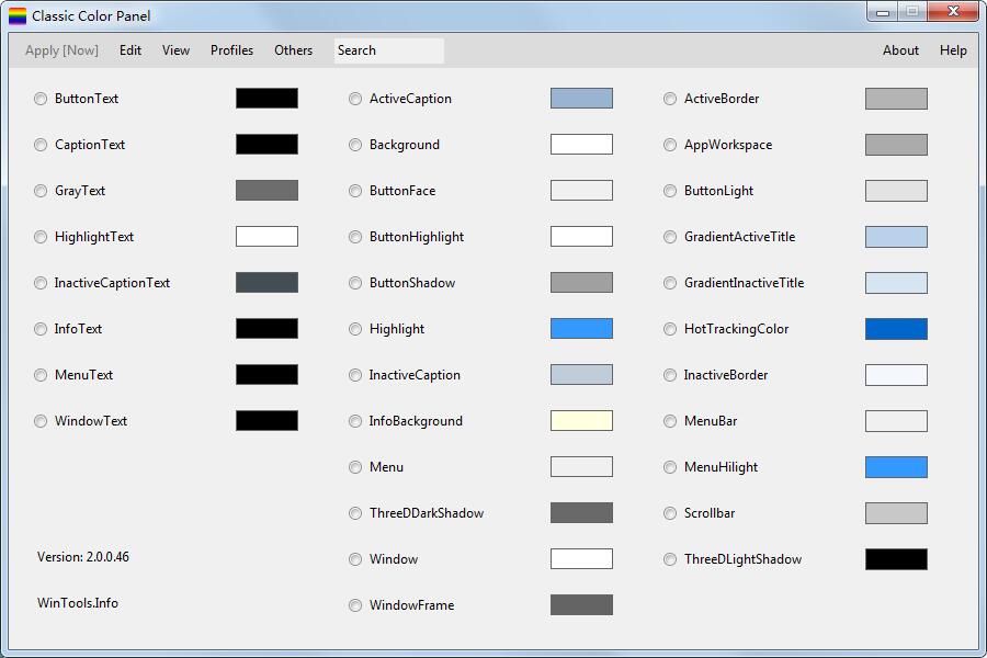 Classic Color Panel是一个实用软件,用于改变Windows系统级显示的颜色设置,允许改变图像元素、窗口、按钮、控件等的颜色。