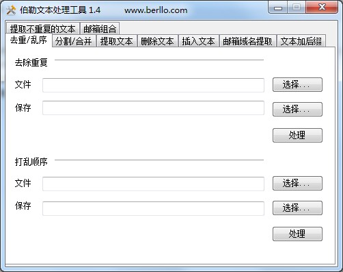 伯勒文本处理工具能够帮助您批量整理磁盘上的多篇文档,一键去除重复,打乱顺序,分割合并文本,还拥有提取功能,除了普通的文本提取功能外,还可以实现多组关键字的提取处理。