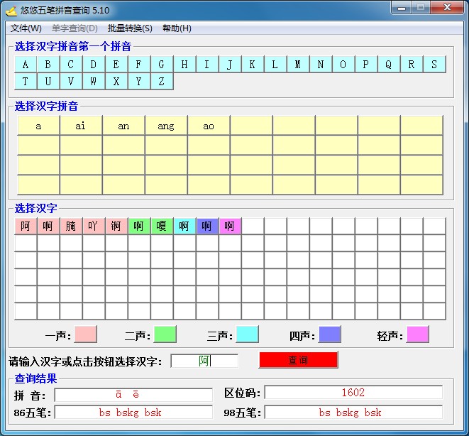 1、即点即查功能:只要用鼠标点击汉字第一个拼音,就可以得到汉字以及汉字的五笔86编码、五笔98编码、拼音(含声调,多音)和区位码。
