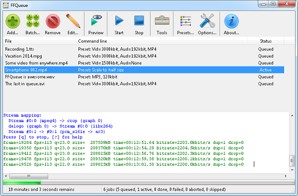 -显示ffmpeg的当前状态和队列。在处理作业期间,如果可能,会显示剩余时间。