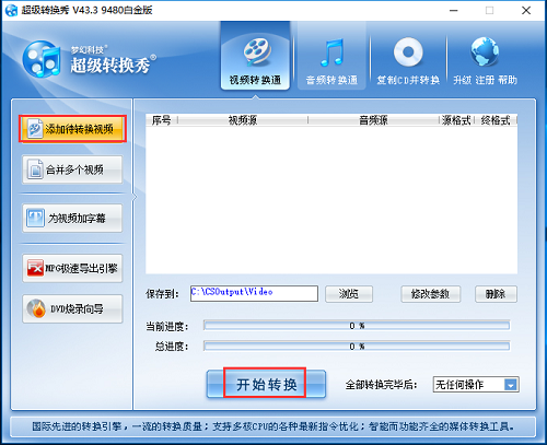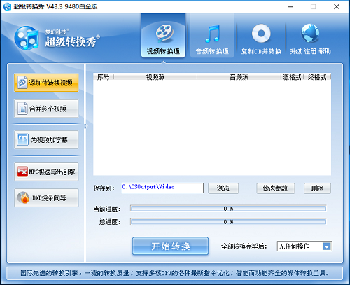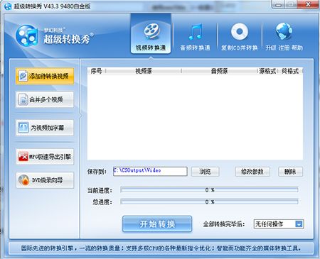 超级转换秀是一款功能强大的影音转换工具。软件支持批量转换处理,支持当前多种流行的音频格式进行转换,还支持不同视频文件和音频文件的混合合成转换,切割转换、合并转换更符合您对转换工具的选择要求。操作简单,有需要的用户快来下载吧!