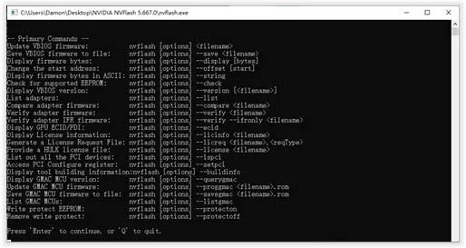 NVFlash是一套在DOS下执行的软件,而且必须配合适当的参数才能行。NVFlash最常用的参数如下: