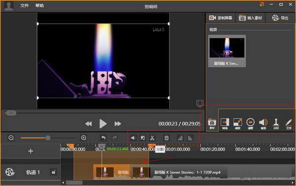 5、最后我们就可以通过时间轴上方的工具,对视频进行剪切,分割等处理。
