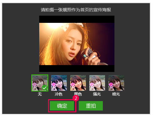 3、选择好视频和音频设备后,进入直播海报的拍摄,同时选择5种不同的滤镜对海报进行处理,上传成功后便可开始直播。 把直播地址(如: http://fanxing.kugou.com/1012043)发给好友,让大家一起观赏您的精彩直播。