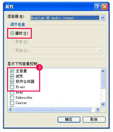 3、选择播放属性后,勾上主音量、波形、麦克风,选择后点击确定;