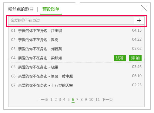 2、添加歌曲时,当用户输入的歌曲名有伴奏匹配时,实时以下拉框的形式显示匹配结果,艺人点击试听按钮即可试听,以确定其是否为所要歌曲。试听时,可以点击暂停按钮停止试听。如下: