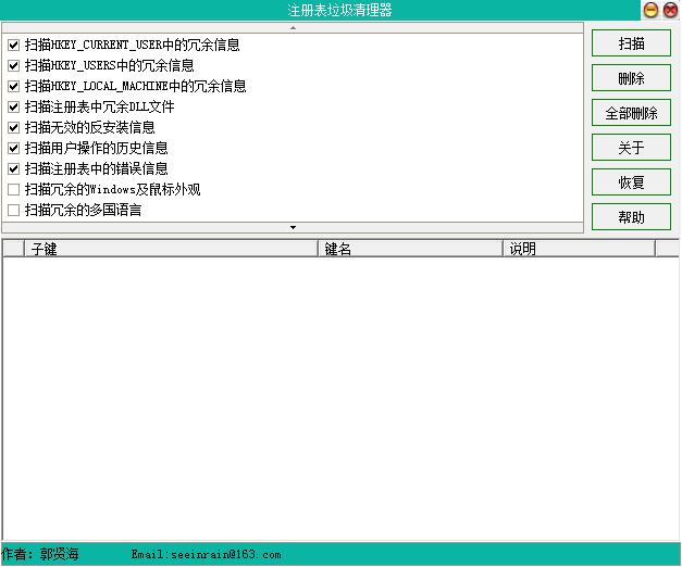 注册表垃圾清理器是一款非常实用的注册表垃圾清理工具,小巧易用,主要功能可帮助您来对电脑的注册表垃圾文件进行快速的扫描,并对指定的文件进行清理操作,同时支持注册表恢复功能。
