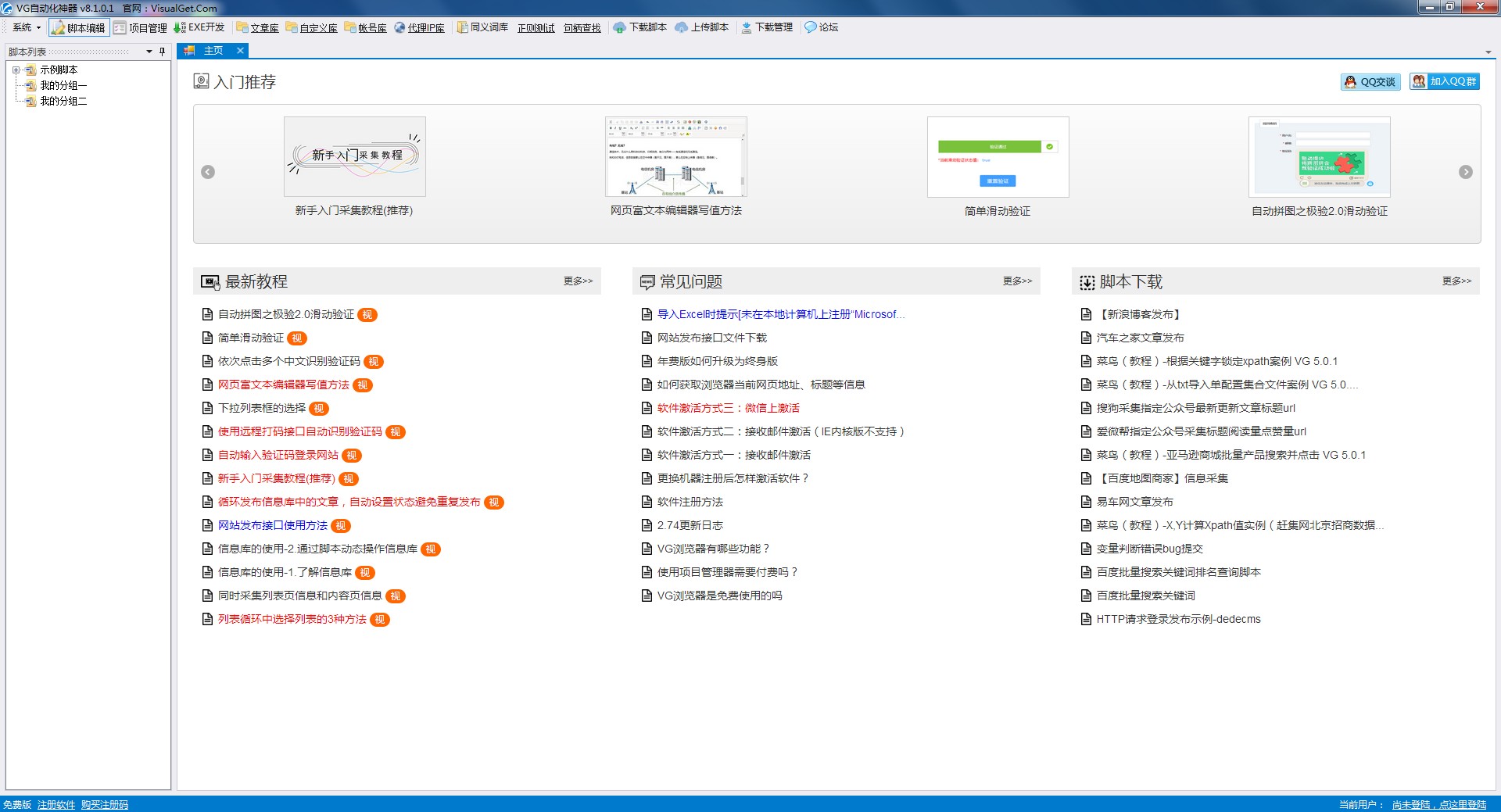 VG浏览器的项目管理器不是免费的,必须要购买注册码注册后方可使用,项目管理器可以独立运行脚本,并且可以多线程、多任务同时运行,每个任务都可以按设定时间定时运行。