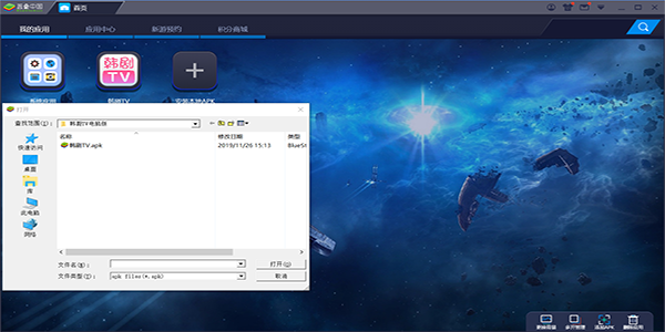 7、打开你下载韩剧TV电脑版存在的文件夹地址,选择韩剧TV.apk,也可以直接将apk格式的文件直接拖到模拟器中。