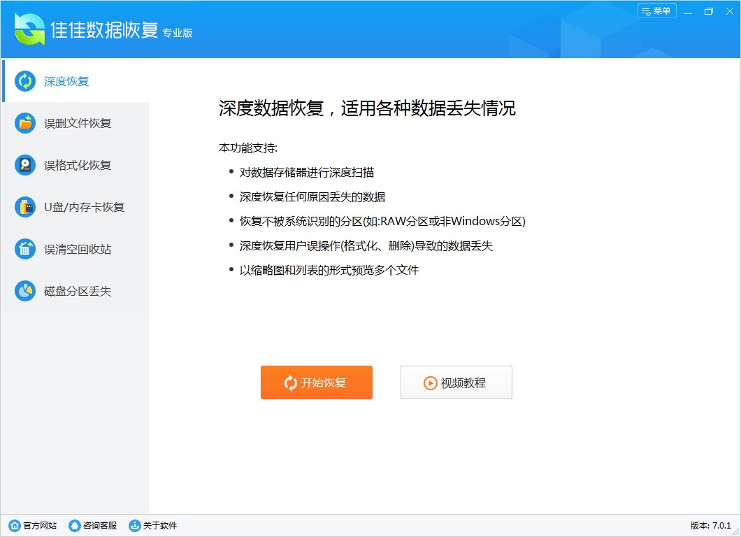 佳佳数据恢复软件有:深度恢复、误删文件恢复、误格式化恢复、U盘/内存卡恢复、误清空回收站、磁盘分区丢失等六大主要功能。请务必根据您的问题选择对应的功能,如果选错功能,恢复效果可能很差!