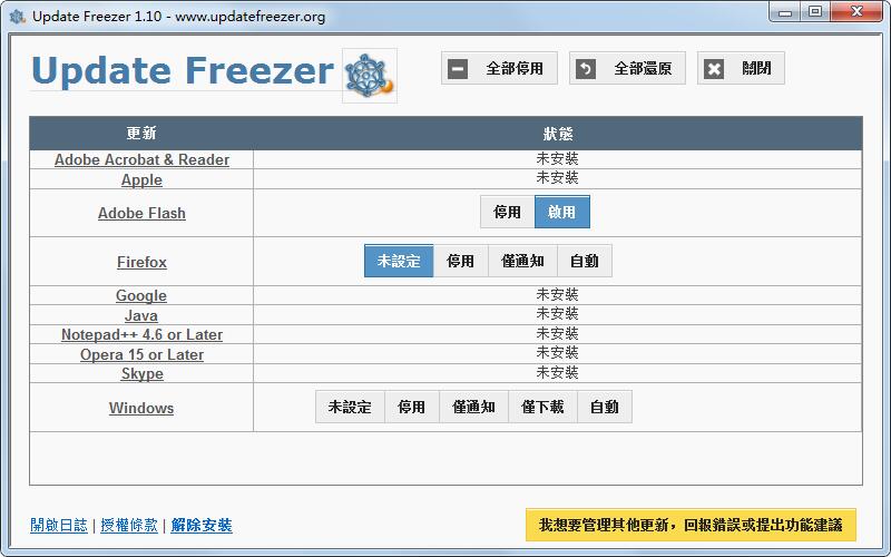 Update Freezer 是一款管理应用软件的自动更新功能的工具,可用于临时一键禁用各类软件的自动更新,能设置自动更新状态为「禁止更新、仅显示更新通知或自动更新」,目前支持的软件包括 Google、Adobe、Java 软件、Firefox、Windows 更新、 等。