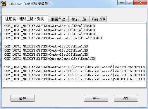 usbclear可以清除电脑使用U盘后操作系统遗留痕迹的U盘痕迹清理器,它主要用于注册表清除,包括受权利限制的主键。还提供自行编辑删除主键的功能,并可自动保存,可扩展为清除注册表中其它无用信息的操作平台。U盘痕迹清理器是一款绿色软件,解压后直接执行即可。