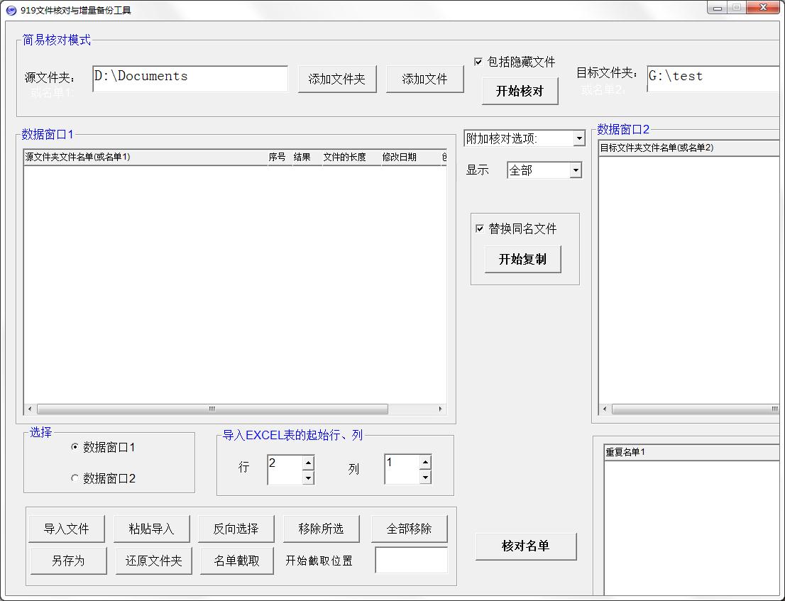 919文件核对与增量备份工具是一款实用的文件管理工具,核对模式分为简易核对模式与非简易核对模式,简易核对模式可一键实行数据导入与核对,可核对两份保存在文本文件或Excel文件中的名单的异同。