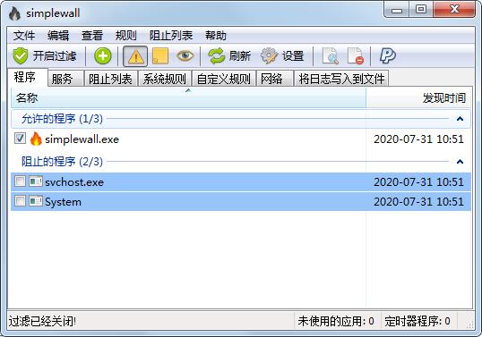 1、下载解压后运行simplewall程序,第一次打开时默认是未启用防火墙的(状态栏的图标是灰色),点一下下面的“未过滤“按钮,启用防火墙。