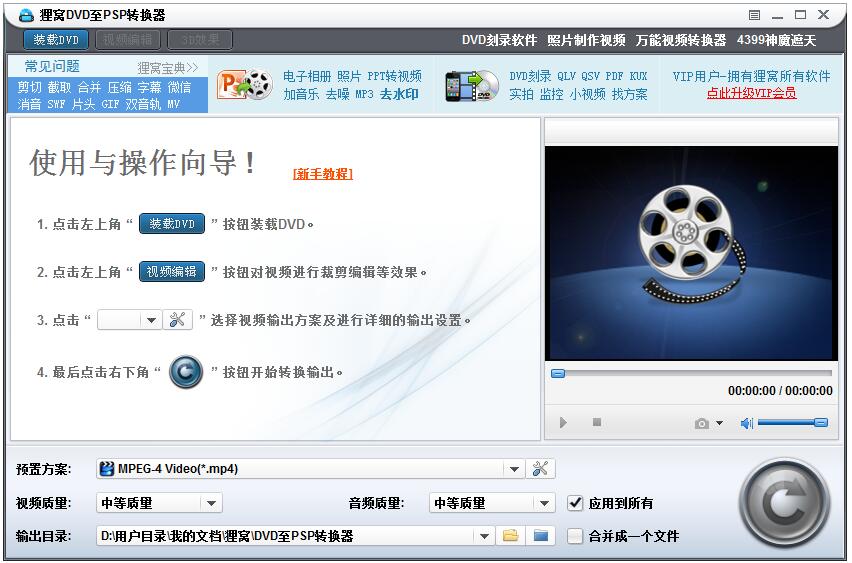 狸窝DVD至PSP转换器是一款简单实用的视频格式转换工具,能够帮助用户将DVD碟片格式文件转换为PSP所支持播放的视频格式文件,另外还具有编辑功能,用户可以轻松对视频进行剪切合并等,十分方便快捷。