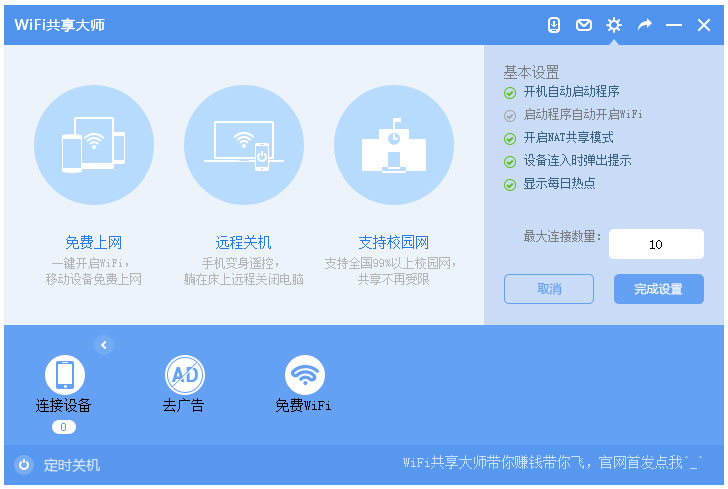 WiFi共享大师校园版除了在原有WiFi共享大师的功能的基础上,使用了全新、简洁的界面,添加了校园客户端的兼容性处理,以及连接设备的查看,开机自动创建免费WiFi共享等功能。