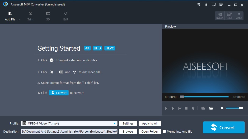 Aiseesoft MKV Converter是一款上手非常容易操作的MKV视频转换器,可以帮助您将MKV视频转换与输出为mp4、m4v、avi、mpg、mov、asf、dv等常见的视频格式或设备格式,您也可以选择从MKV中提取音频并保存为常见的音频输出格式,其提供了对于批量转换的支持。