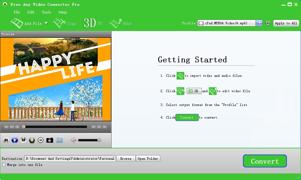 Free Any Video Converter Pro是款功能出众万能的视频格式转换器,可以转换各种常见的视频格式,如MP4、H.264/MP4 AVC、MTS、MXF、MOV、AVI,还支持各类高清蓝光以及3D格式的转换。操作简单,效果极佳,是视频工作者的好助手。