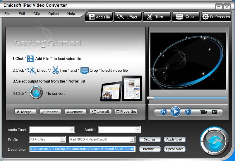 Emicsoft iPad Video Converter是一款体积小巧、功能全面实用的iPad视频转换器,支持将mp4、avi、flv、vob、mod等各类主流的视频文件转换与输出为iPad兼容格式。该程序还具有视频合并、视频重命名、视频剪切等多种常见编辑工具,可以在转换前对视频进行处理。