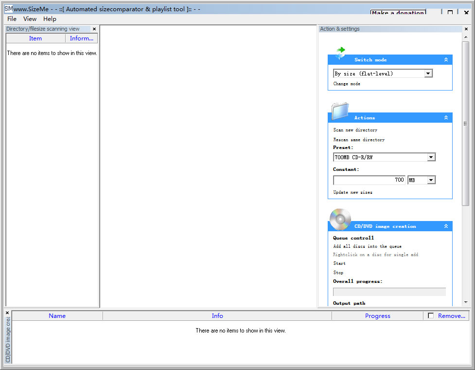 SizeMe让你可以为了刻录一个选择的目录简单地估算需要多少张CD、DVD或者其它媒体介质空间。该软件创建一个用于每张磁盘刻录尽可能多的内容的规划,你可以简单地将其拖拽到你的CD/DVD刻录软件当中并且开始刻录媒体。你还可以从所有或者选择的媒体集创建ISO映像文件,因此你可以以后再对其进行刻录。