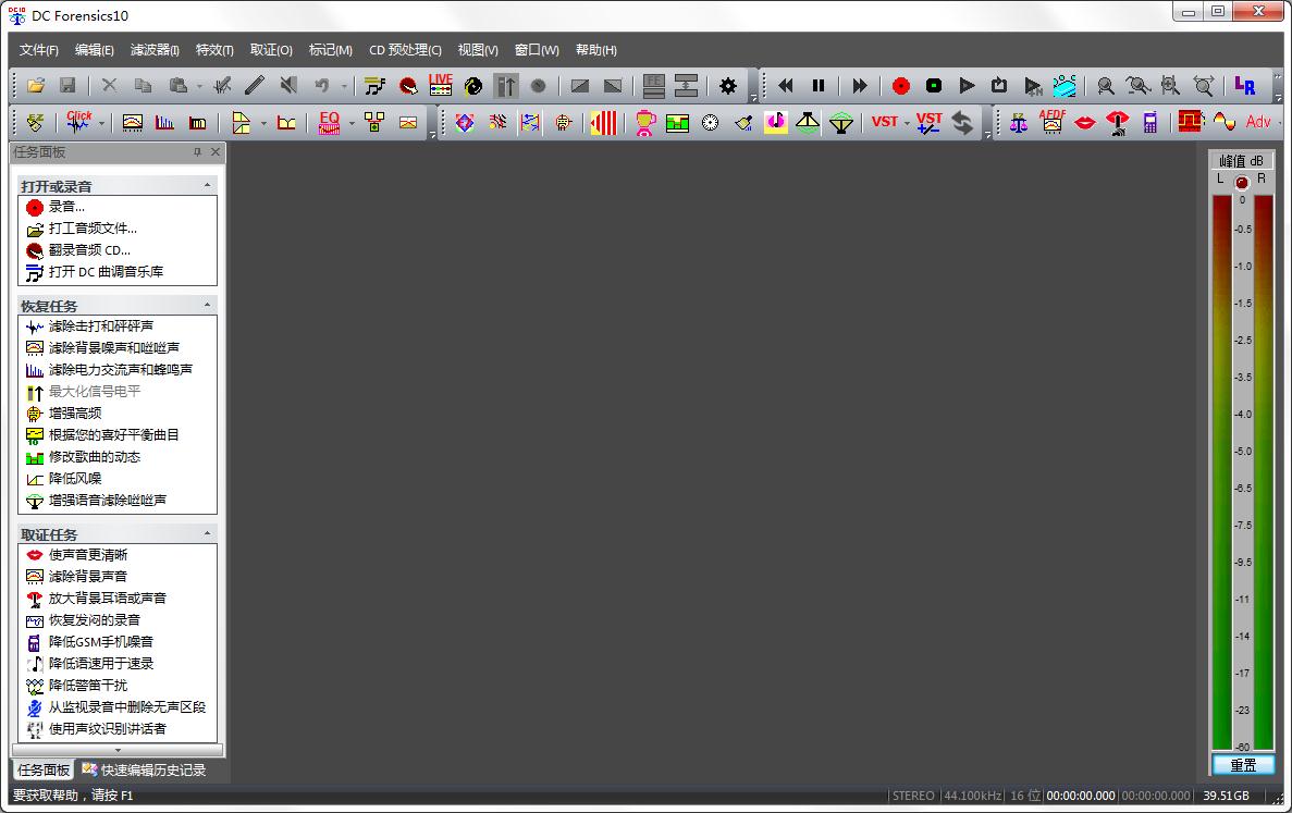 DC Forensics是一款专业的音频取证降噪工具,具有丰富的音频修复与增强功能,可以帮助用户轻松完成音频文件的修复、优化、降噪、录音等操作,还增加了对接历史对话框窗口,VU 表和文件信息对话框,可定制的应用程序,从主窗口图或直方图视图快速访问。