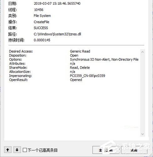 4、属性界面为我们展示了进程或程序的启动日期、线程、类别、操作、结果、路径以及持续时间等数据;