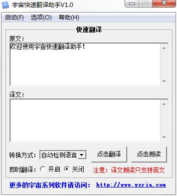 宇宙快速翻译助手是一个在线翻译工具,支持中文、英文、法文、日文互译,不同于其他同功能翻译工具的地方是,它可以监视系统剪切板,从而实现快速翻译,快速复制译文,并且可以朗读译文。
