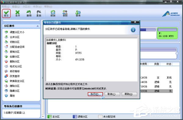 3、返回到分区助手软件主界面,我们点击界面上方的“提交”选项,就会弹出等待执行操作的窗口,我们点击执行就可以开始创建了,等到执行完成就可以看到创建的分区了。