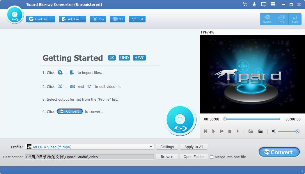 Tipard蓝光转换器是一款专门设计的软件,围绕易用性和用户友好的概念。它采用了最好的加速技术--NVIDIACUDA技术和AMD APP加速技术,可以在配备多个CPU的计算机上实现更少的耗时和更快的文件转换。至于业余新手,这款蓝光开膛手在主界面上提供简单的插图图像指南,简单而实用。只需几个简单的步骤即可完成整个蓝光/ DVD /视频转换过程。此外,在一定程度上,其配置文件列表和类别的连贯布局使得用户友好的快速搜索框架使得配置文件选择更加平滑。