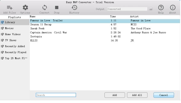 您可以从要转换的iTunes播放列表中选择iTunes视频,然后按“添加”按钮。或者按“全部添加”按钮导入所有可用的iTunes视频。注意:您也可以使用“搜索”来查找要使用Easy M4V Converter for Windows转换的文件。