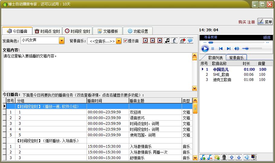 博士自动播音专家是一款可以代替播音员进行广播的自动广播系统,一款自动播音软件,超市播音软件,让电脑开口说话的软件。它可以定时播放文稿、定时播放Mp3等音乐的全自动智能广播系统。同时可以播放中文、英文、日文、韩文等多个国家和地区的文字,播音效果可与专业播音员相媲美。是一款集广播和广告制作的完美软件!
