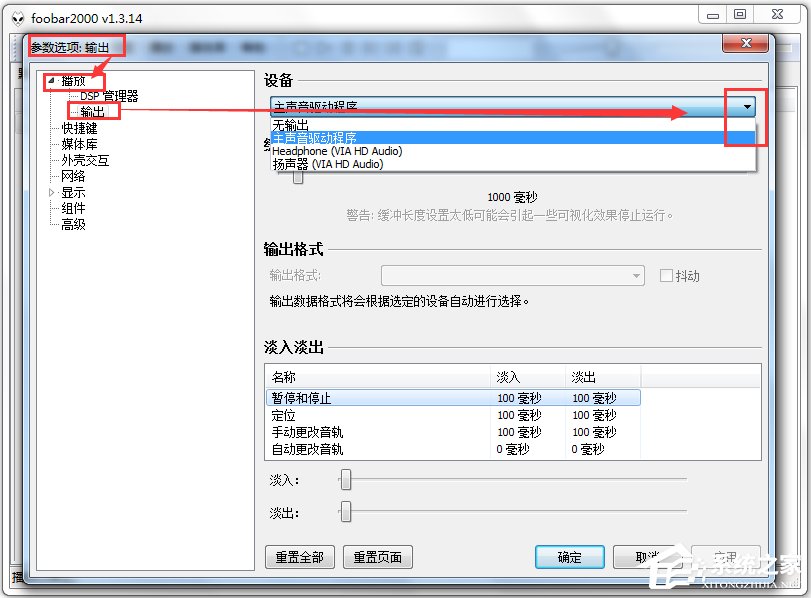 2、点击应用后,会重新启动Foobar,在参数选项的播放-输出-设备下拉菜单,可以看到多了2项WASPI的选项,这个显示是与个人的电脑硬件配置有关的,所以不一样是正常的!