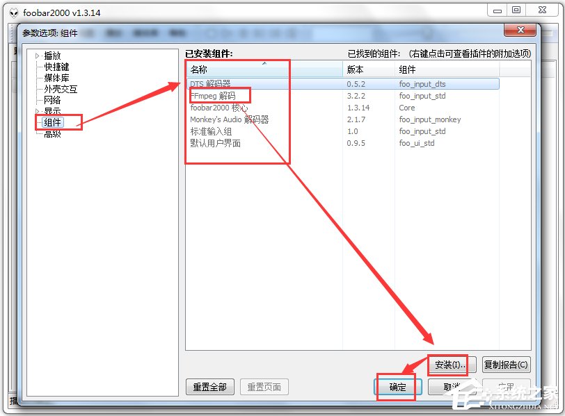 1、打开Foobar2000,点击“文件”菜单中的“参数选项”再选择其中的“组件”具体看图。右侧的已安装组件,选择“安装”,找到之前保存的已经下载好的加载项目文件。