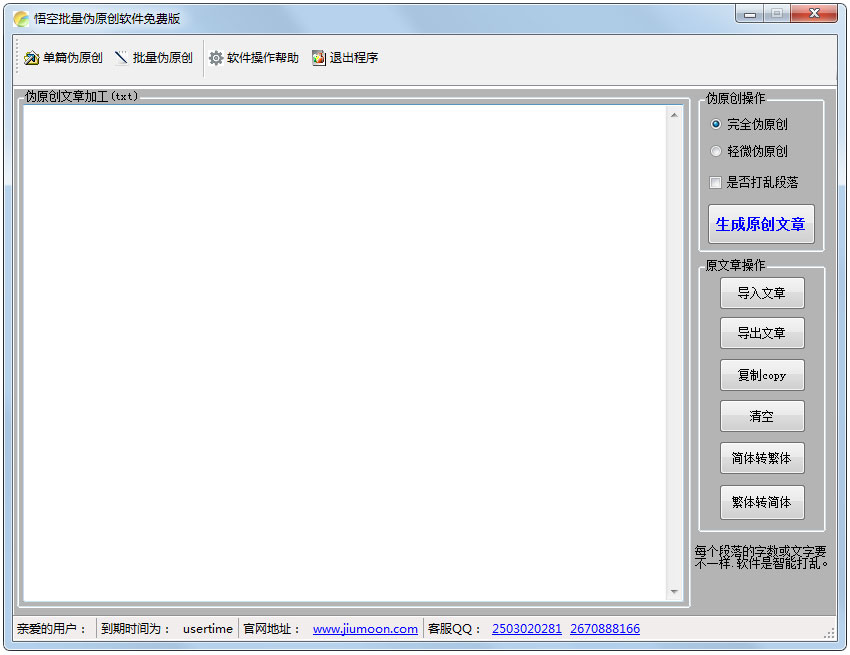 悟空批量伪原创工具是一款简单易用的伪原创工具,这款伪原创工具功能全面,能够智能打乱段落,可在批量伪原创的时候,在每个文章内加入关键词及链接,有效的提高收录,对网站排名和权重提高非常重要。