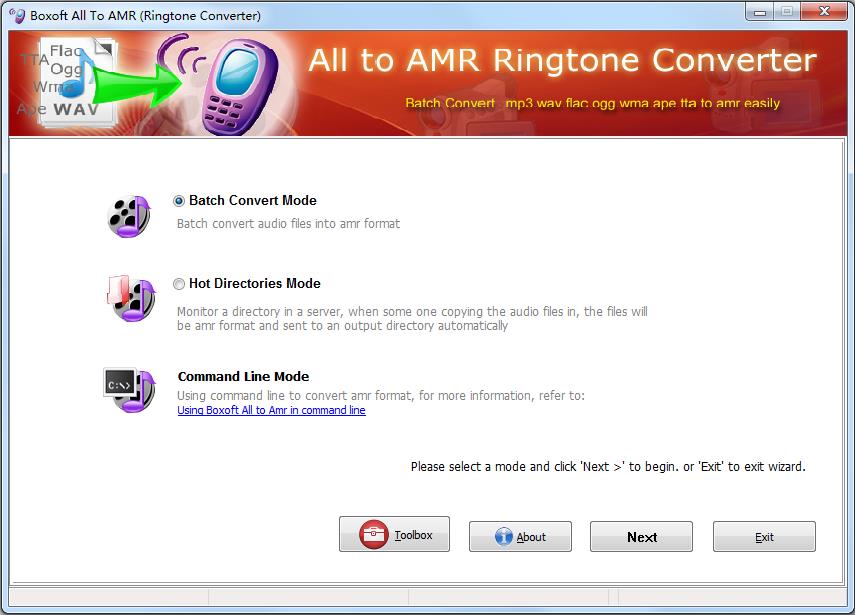 批量转换模式:批量转换多个不同,节省您的时间;热目录模式:自动转换音频文件到铃声的简单转换模式;命令行模式:支持编写命令行来完成音频转换工作。