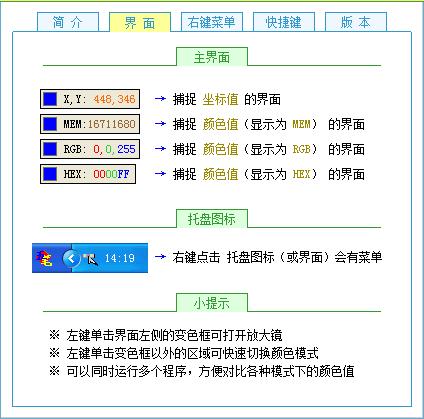 3、取色条(ColorTip)可以查看电脑屏幕上任意一点的RGB参数,拷贝屏幕上任意一点的颜色值或坐标值到剪贴板。