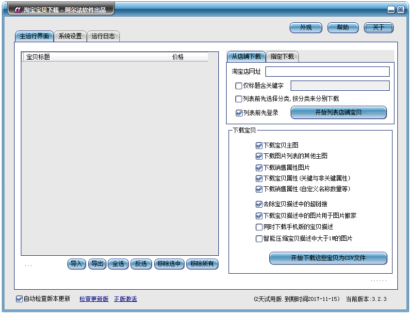 阿尔法淘宝宝贝下载是阿尔法软件推出的一款的宝贝复制软件,可以完整或的克隆别人的店铺,也可以有选择的复制别人的部分宝贝,比如您想代理某店的商品,不用征求他的同意,直接下载他店宝贝然后上您店里。