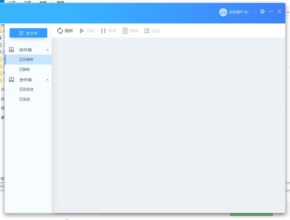 3、软件登录成功之后,即可进入软件的正在接收界面,包括了刷新、开始、暂停、删除、多选等;