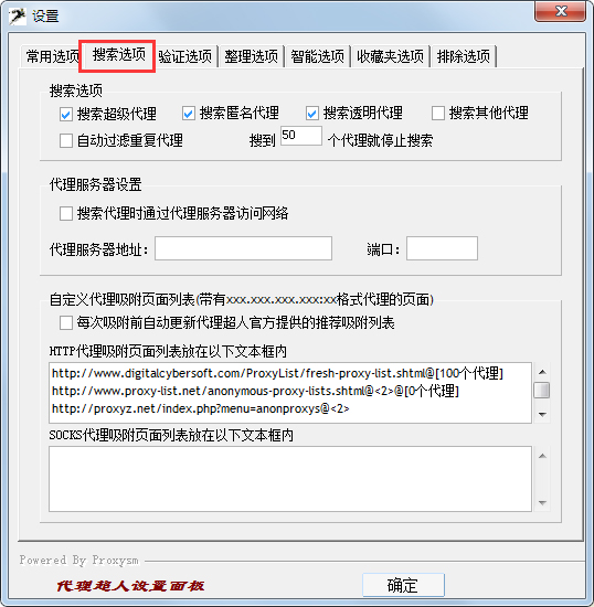 2、在搜索选项里,你可以选择搜索超级代理还是透明代理还是匿名代理,以及设定搜索到多少个代理来停止搜索等等;