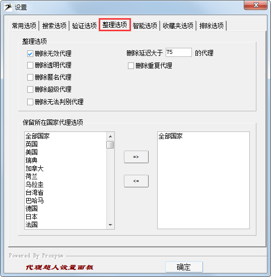 3、然后来看整理选项,你可以设定删除掉种种你不需要的代理或延迟比较大的代理,你还可以只设定保留哪几个国家的代理,这样对申请图床或空间的时候很有利哦;