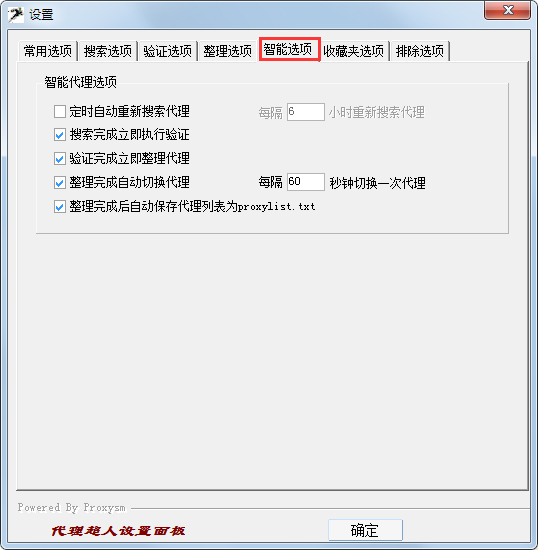 4、再来看看智能选项,你可以设定隔几个小时来重新搜索代理及隔多少秒来切换代理等等;