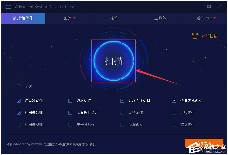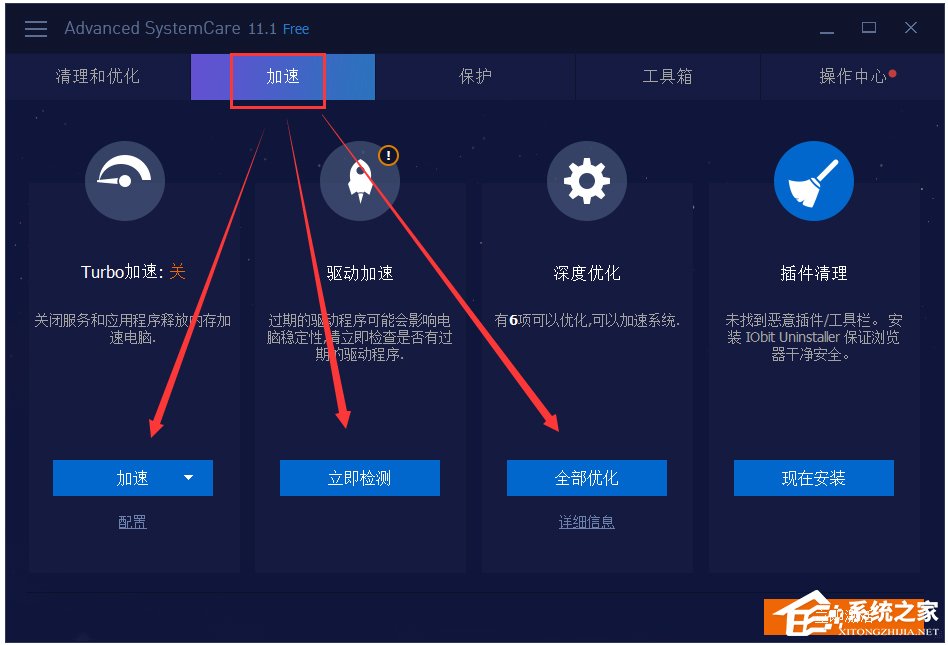 而 Advanced SystemCare【加速】模块提供四个优化项,帮助您清理电脑内垃圾文件以及释放更多的磁盘空间;优化注册表、整理碎片和删掉所有无用的应用程序。