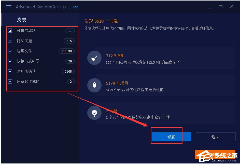 Advanced SystemCare 为十多种电脑常见问题提供一键扫描,修复功能。您仅需在【维护】模块勾选要解决的问题,然后点击【扫描】…等待扫描完毕后,点击【修复】即可轻松地一键修复问题。
