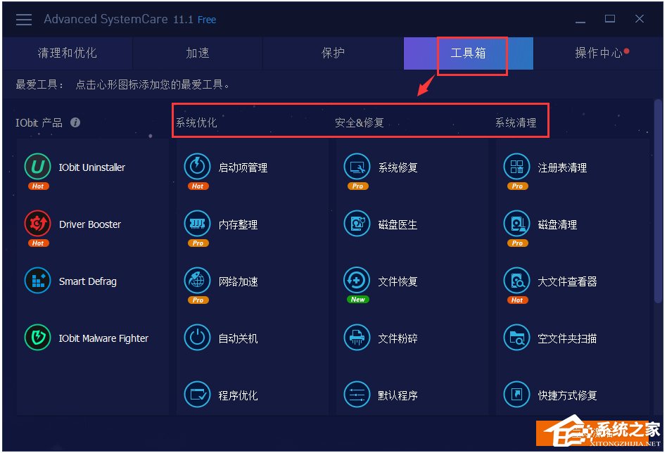 Advanced SystemCare 除了提供一键维护和加速优化功能,还集成了一个万能的【工具箱】。