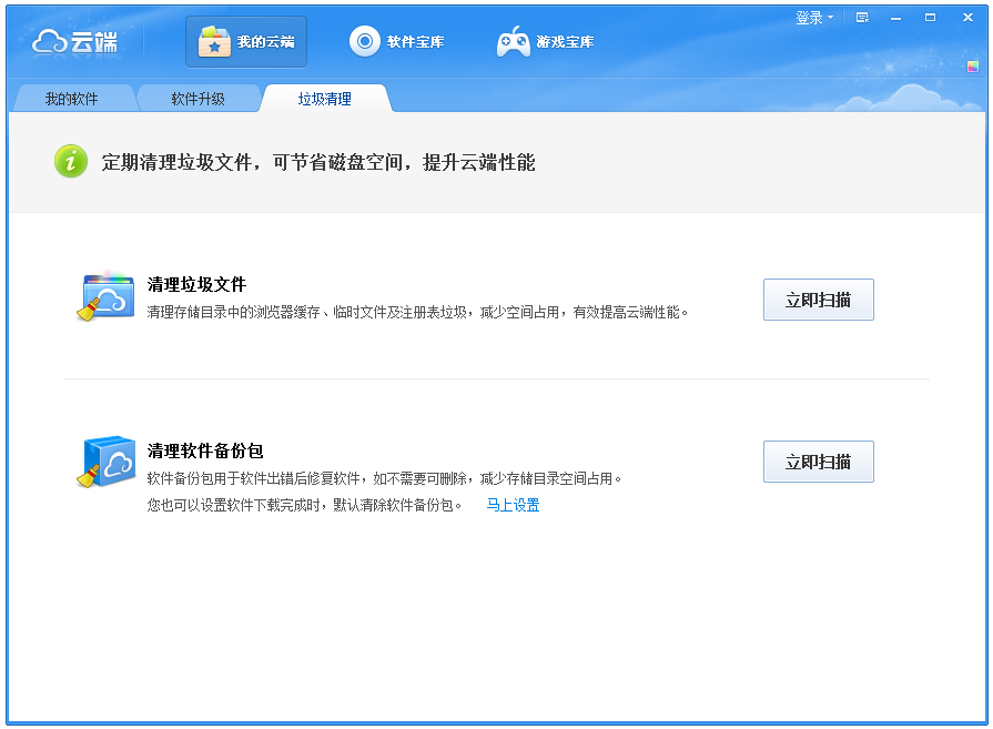 云端软件平台是一款功能非常强大的云端软件,云端软件平台拥有近万款的软件资源,都无需安装,一键使用,不写注册表、不写系统;无用软件可以一键删除,快速干净不残留。云端软件平台实现真正的完全的软件绿色化。