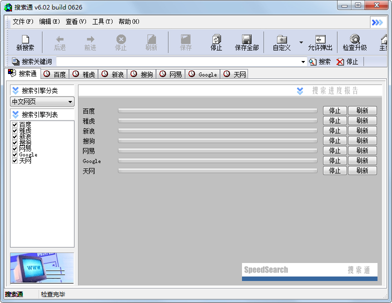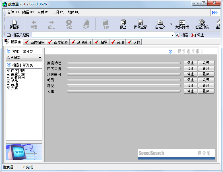 ZDNET五星级的优秀网络信息搜索工具,整合包括网页,软件,新闻,图片,论坛等多类别近五十个搜索引擎的全方位互联网信息检索工具。采用多线程并行运作,同步开动近十个搜索引擎进行检索。内置多窗口支持的浏览器,直接浏览结果,高效易用。中文免费软件,无插件,无时间限制,无功能限制,无广告。