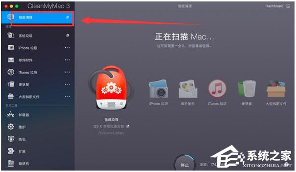 点击右下角的“Scan”按钮,CleanMyMac将对整个系统进行扫描。