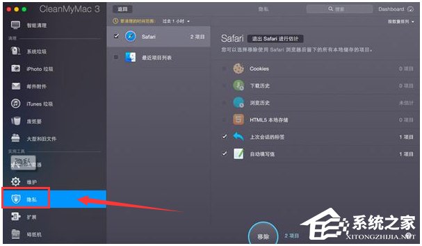 隐私功能可以立即清除浏览历史以及在线和离线活动的痕迹,点击“选择项目”,选择其中的某些项目,然后点击“移除”即可。