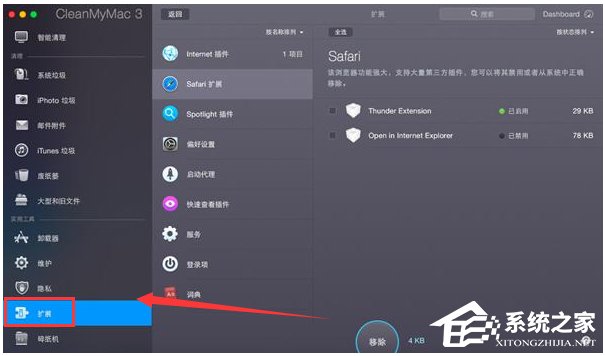 扩展功能可以删除或者禁用Widget、应用程序插件、偏好设置面板、词典、屏幕保护程序和登陆项。点击“查看全部扩展”,根据实际情况即可实现禁用或者移除。